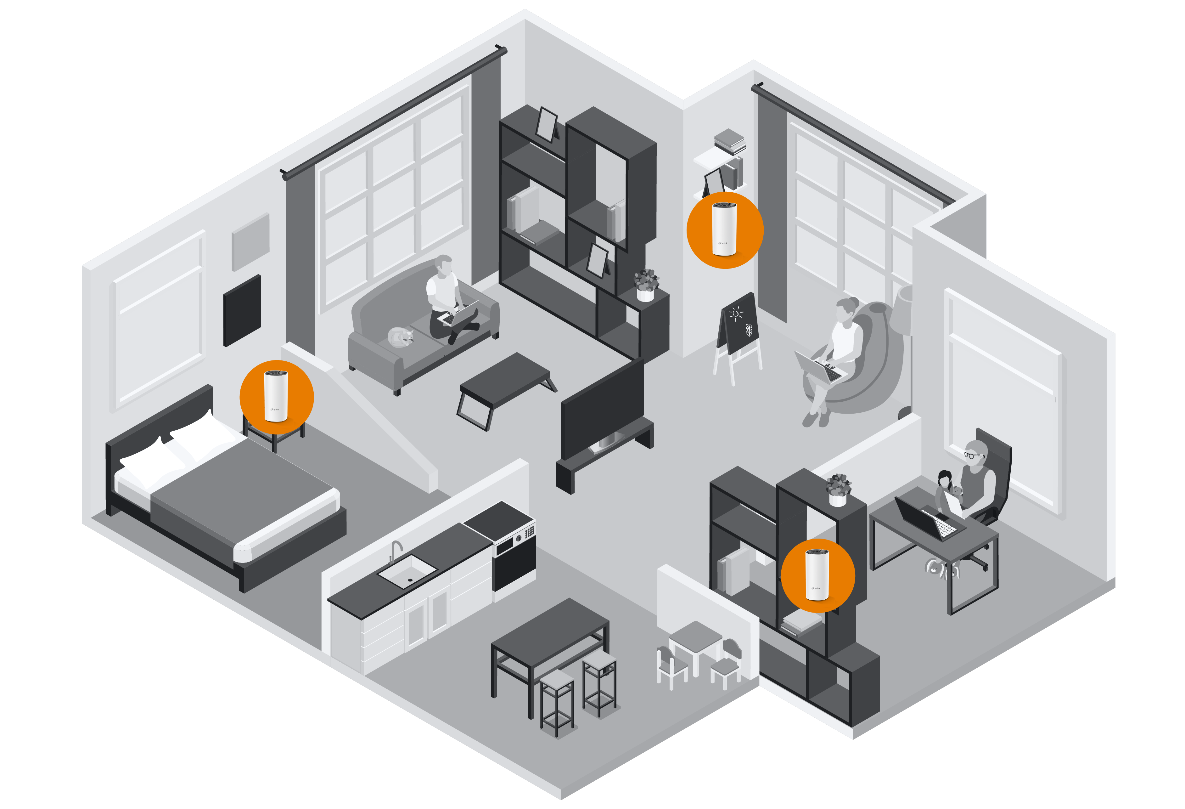 Создать бесшовную Wi-Fi-сеть (Mesh Wi-Fi) в большой квартире (более 90 м²) со сложной геометрией.